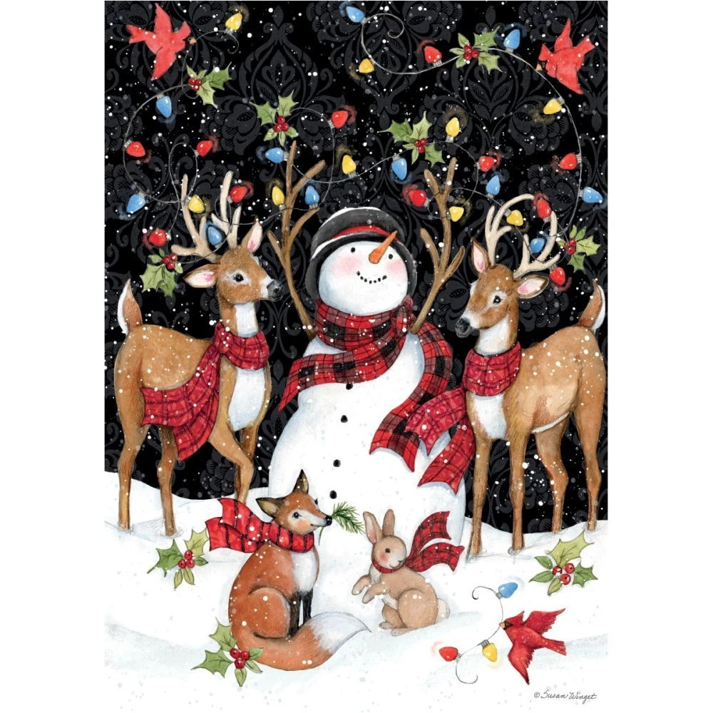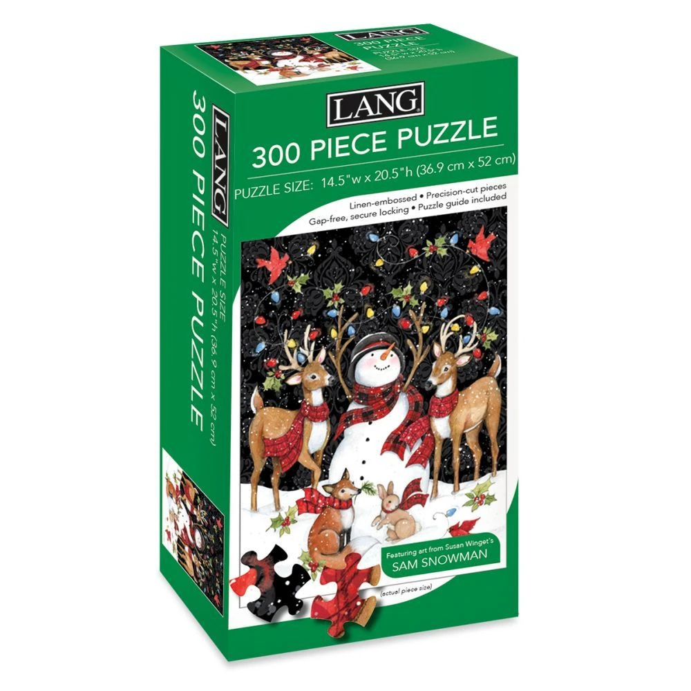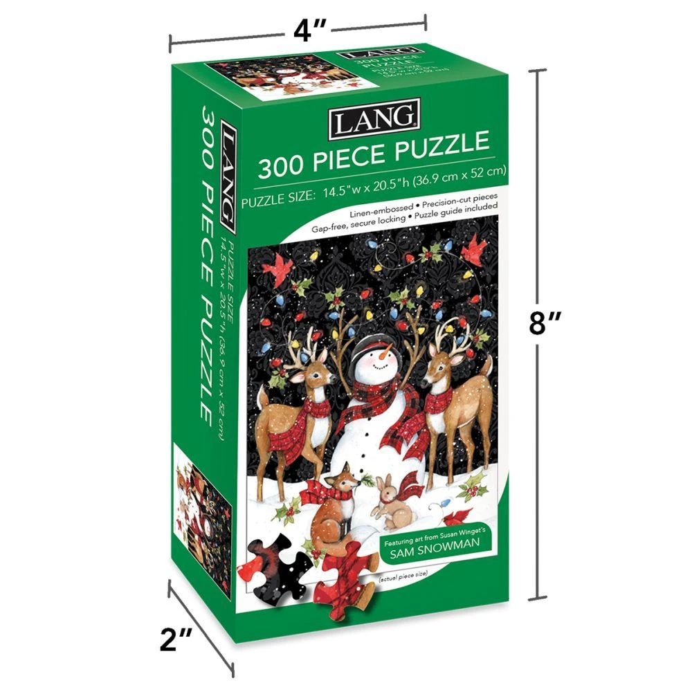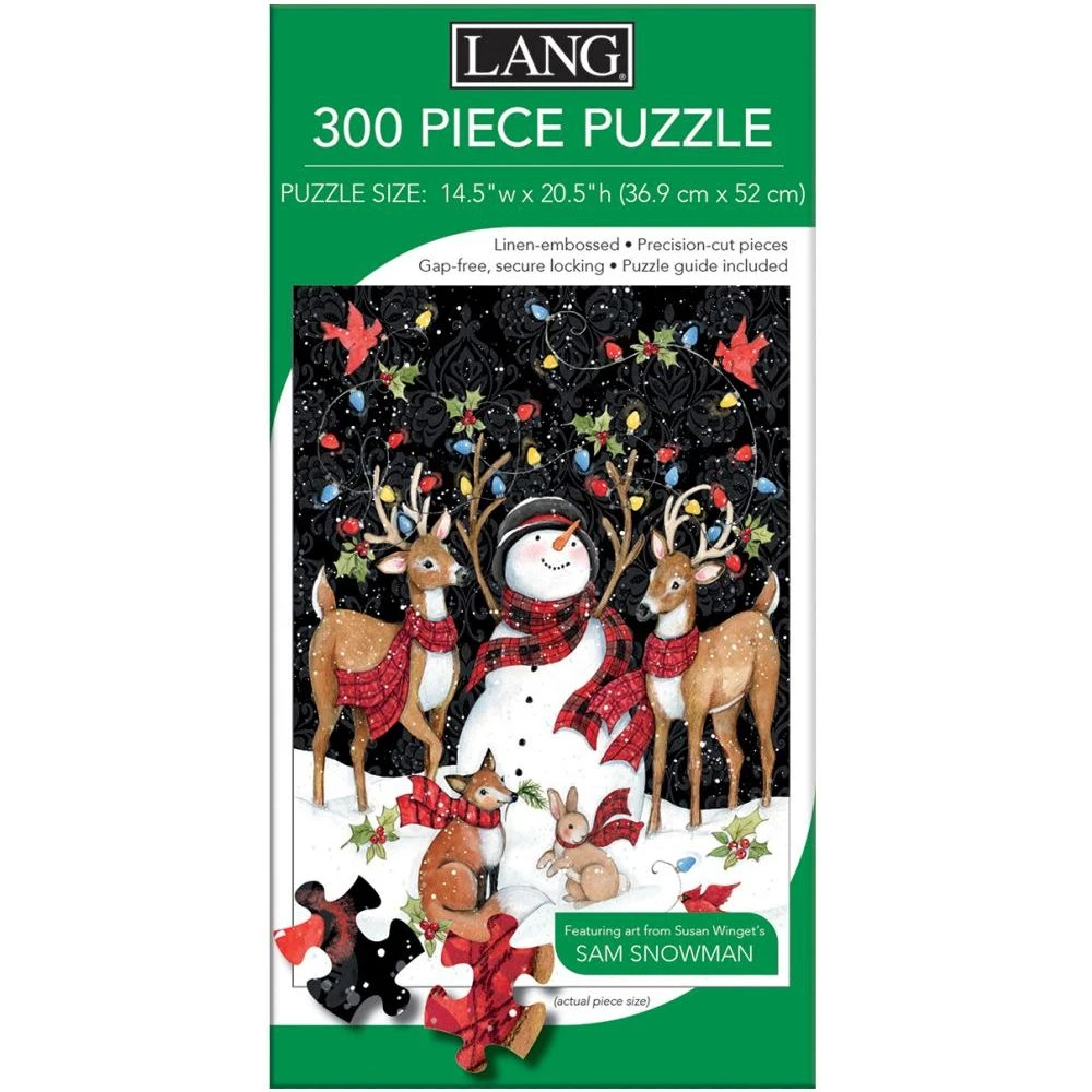 LANG jigsaw puzzles are a fun, yet challenging activity to do with friends and family. Assemble the Snowy Lights 300 Piece Puzzle by Susan Winget featuring Sam Snowman, deer and festive holiday lights! All pieces, finished with elegant linen embossed paper, securely lock in place and come in a resealable plastic bag. An art print guide is also included to help you solve this challenging puzzle!