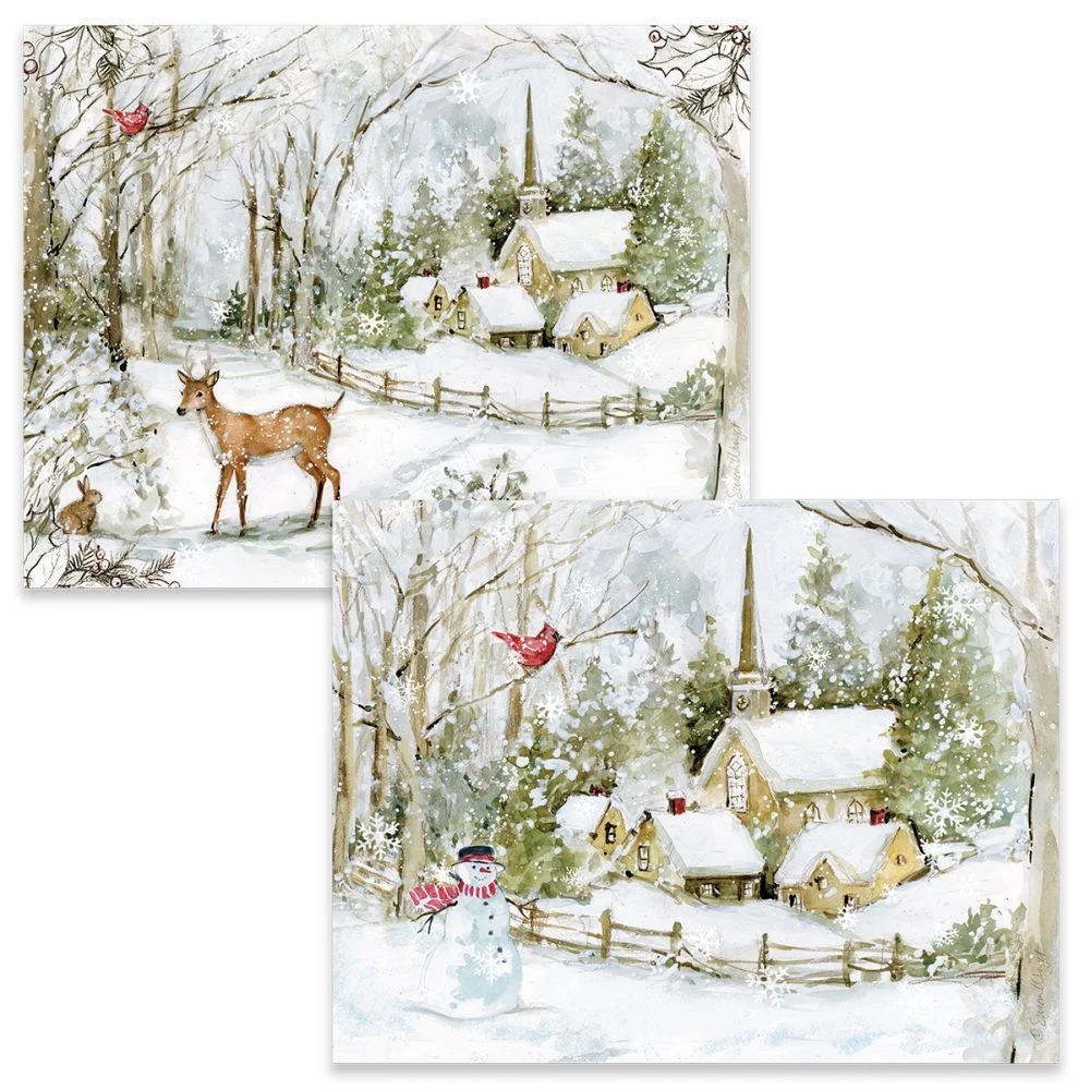 Snowy Scene Assorted Boxed Christmas Cards include two variations of Susan Winget’s holiday artwork on linen embossed paper stock. Includes 18 cards and 19 envelopes.