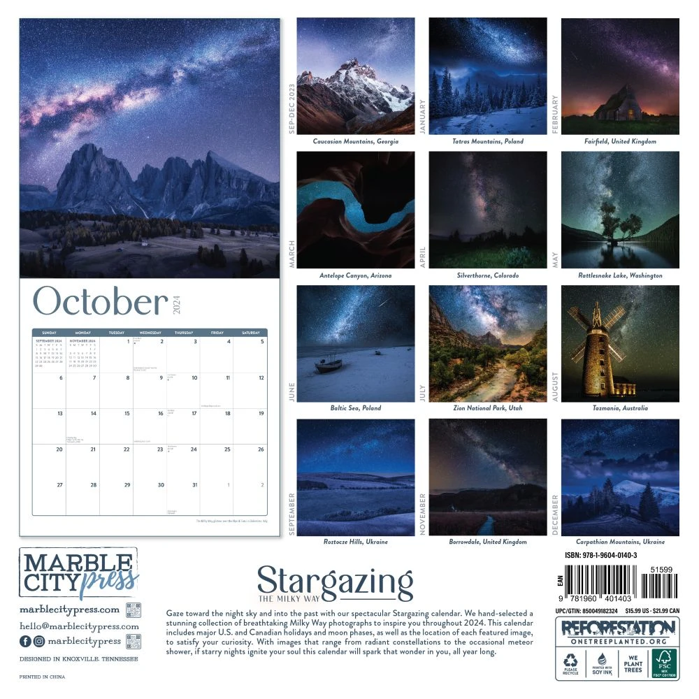Gaze toward the night sky and into the past with our spectacular Stargazing calendar. We hand selected a stunning collection of breathtaking Milky Way photographs to inspire you throughout 2024. This calendar includes major U.S. and Canadian holidays and moon phases, as well as the location of each featured image, to satisfy your curiosity. With images that range from radiant constellations to the occasional meteor shower, if starry nights ignite your soul this calendar will spark that wonder in you, all year long.