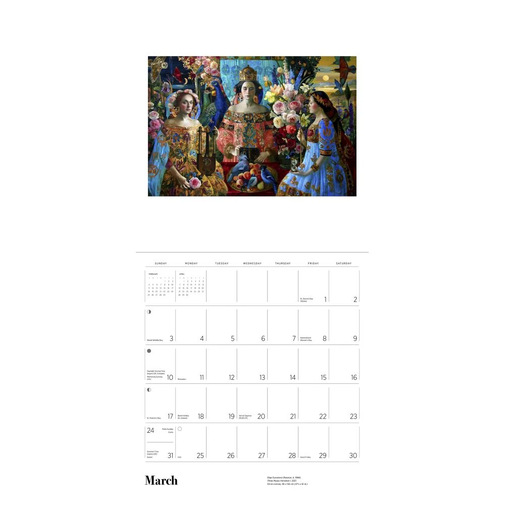 Be swept away by the visual dance of Olga Suvorova?s opulent paintings. With poisedchoreography and lavishly decorated costumes, characters and themes are depicted in a signature style influenced by the Pre-Raphaelites, Gustav Klimt, and traditional Russian icons. Her ornate costumes?their silks and velvets, jewels and embroideries?are often the stars of any scene, which she rounds out with musical instruments, games of chance, and more than a few sidelong glances. Suvorova, who comes from a three-generation dynasty of artists, studied monumental composition at the St. Petersburg Academy of Fine Arts. She is known for her portraiture, both at home in Russia and around the world. Twelve of her gorgeous paintings are on exhibit within this calendar.