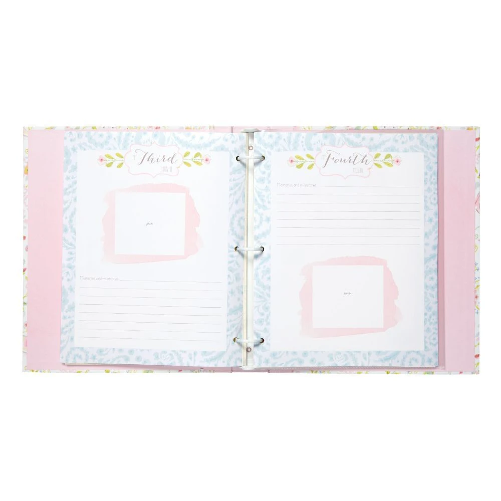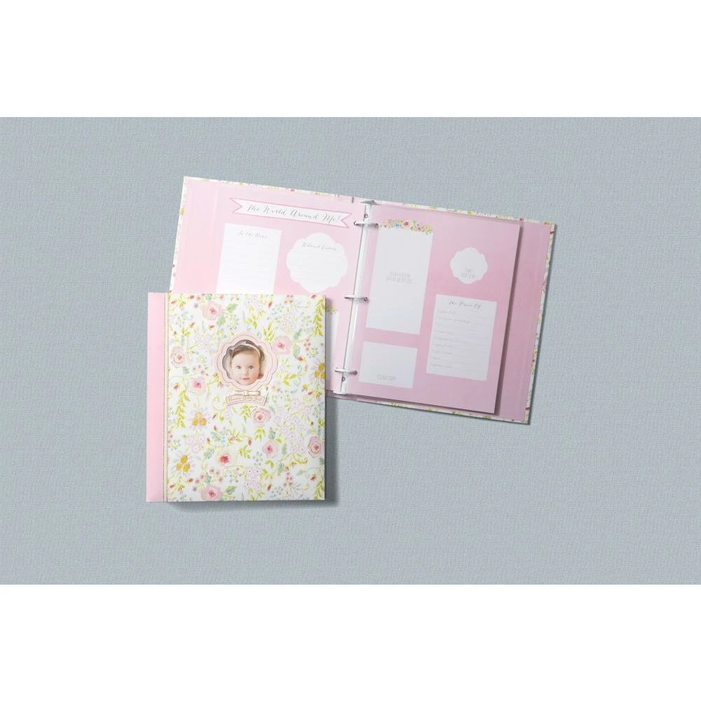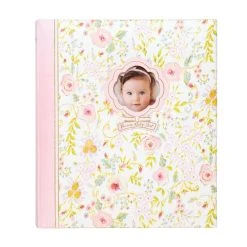 64 page albums for recording baby’s first 5 year memories and milestones. Includes 8 additional blank pages and 3 clear pocket pages. Measures 10.125″ x 11.5″ Expandable loose leaf format. Acid free, lignin free. Gift Boxed