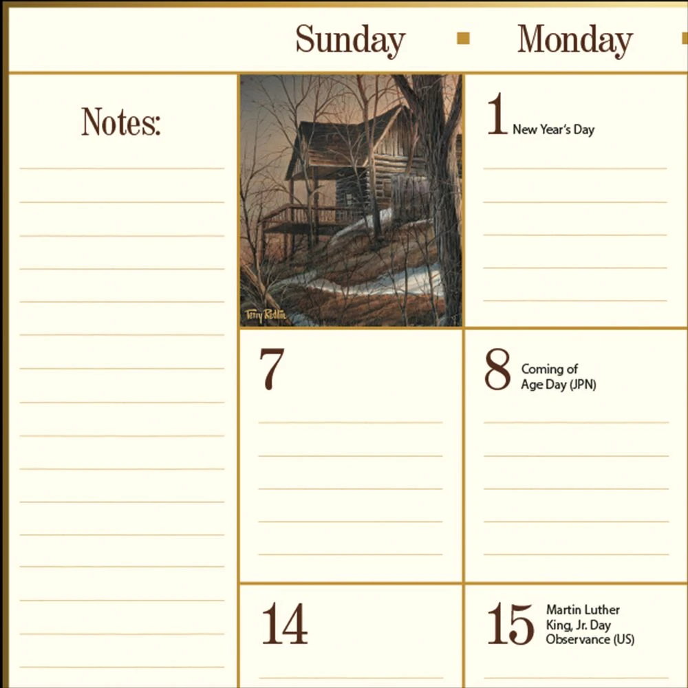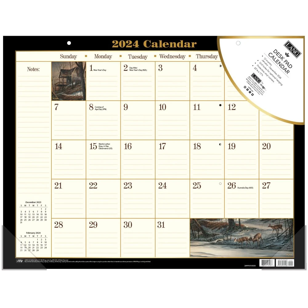 The Terry Redlin 2024 Desk Pad Calendar features a large monthly calendar grid decorated by LANG artwork of rural scenes as depicted by Terry Redlin. LANG Desk Pad Calendars include ample spaces for writing notes and engagements, sturdy backer board to protect your desk, and clear plastic corner protectors.