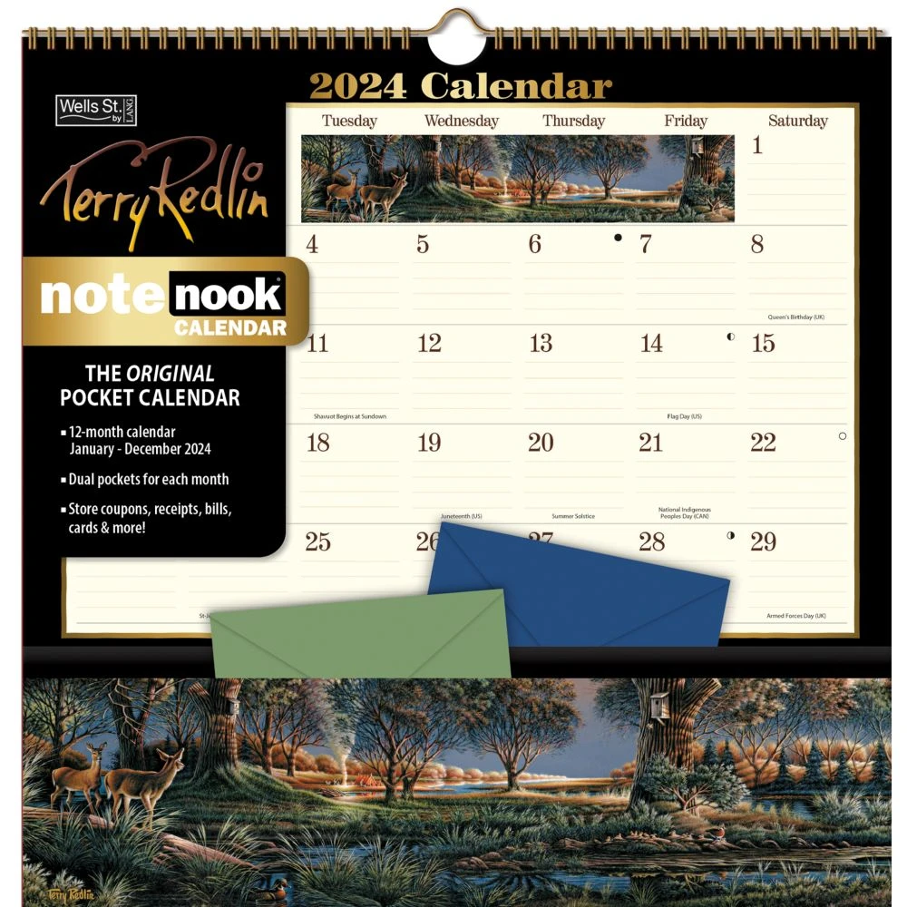 Note Nook, the original twenty four pocket calendar, is designed to help you stay organized all through the year! The Terry Redlin Plan It 2024 Note Nook contains 12 months of calendar grids, decorated with nature themed artwork each with two pockets to store coupons, bills, receipts and more!