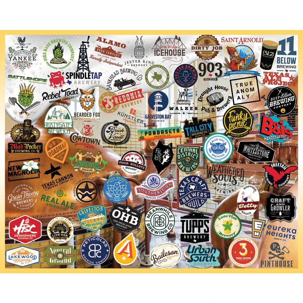 Texas Craft Beer 1000 Piece Puzzle This 1000 piece jigsaw puzzle contains thick interlocking pieces made from recycled premium blue chipboard that give a sturdy feel & easy grip. Made in USA. Finished size 24?x30?.