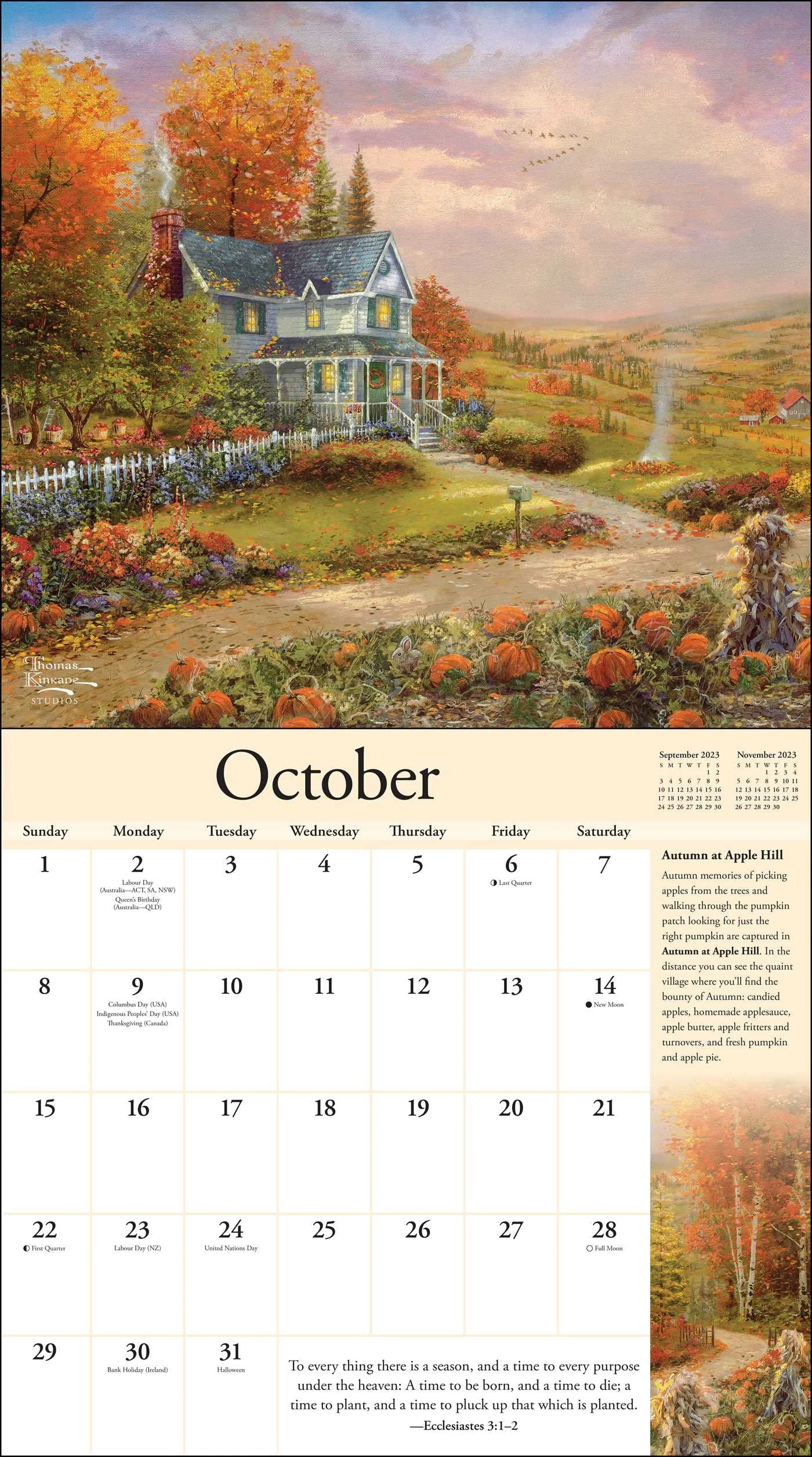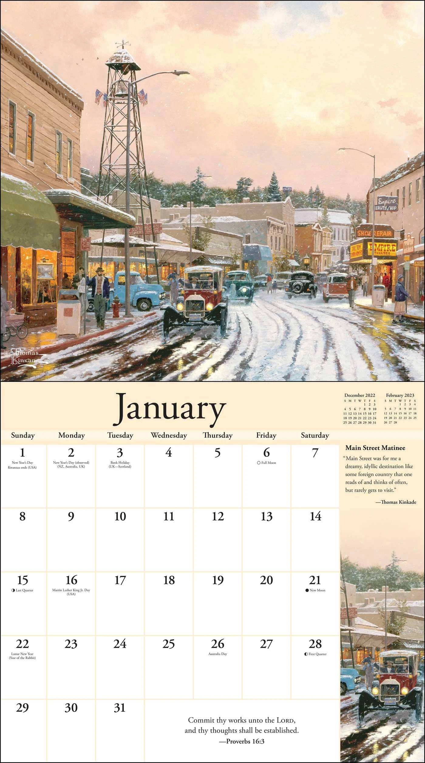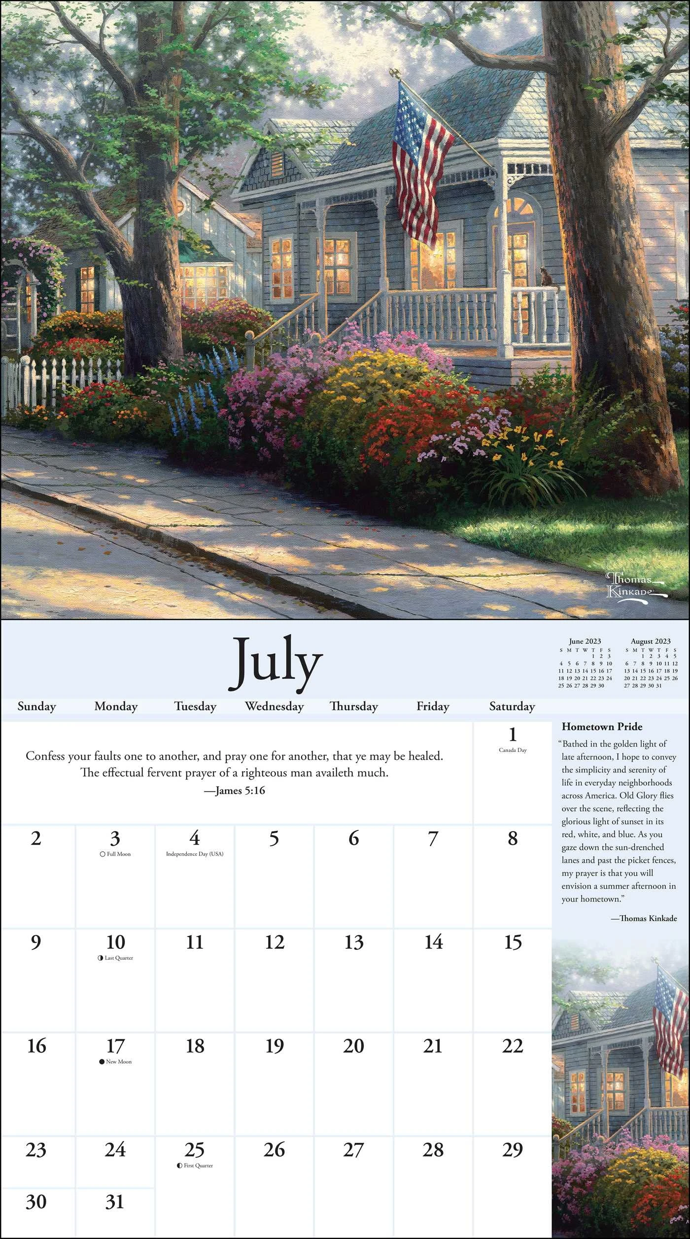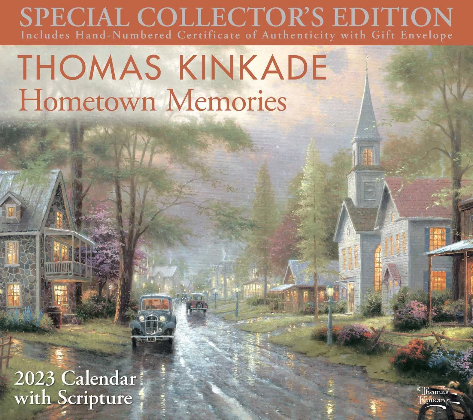 Thomas Kinkade Studios carries on the artist’s legacy of creating and sharing beautiful images that evoke a sense of peace, inspiration, and gratitude. The 2023 theme is Hometown Memories, and each monthly spread shows an image such as Sunday Outing or Hometown Pride, and includes art notes about the painting and Bible verses for reflection or Scripture memorization. As as added bonus, a print of Hometown Memories is included.Features include:Matching plastic free envelope13.5″ x 12″ (13.5″ x 24″ open)Printed on FSC certified paper with soy based ink8.5″ x 11″ print entitled Hometown Memories, ready for framingHand numbered certificate of authenticity in a vellum like envelopePlanning spread for SeptemberDecember 2022Spans JanuaryDecember 2023Generous grid space to add events, appointments, and remindersBible verses from the King James VersionOfficial world holidays and observancesMoon phases, presented in Universal TimeImages of cities, towns, and countryside