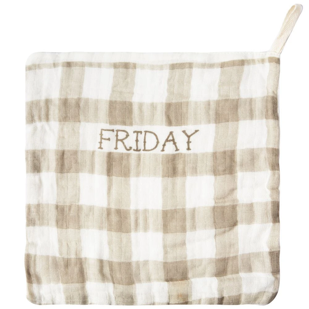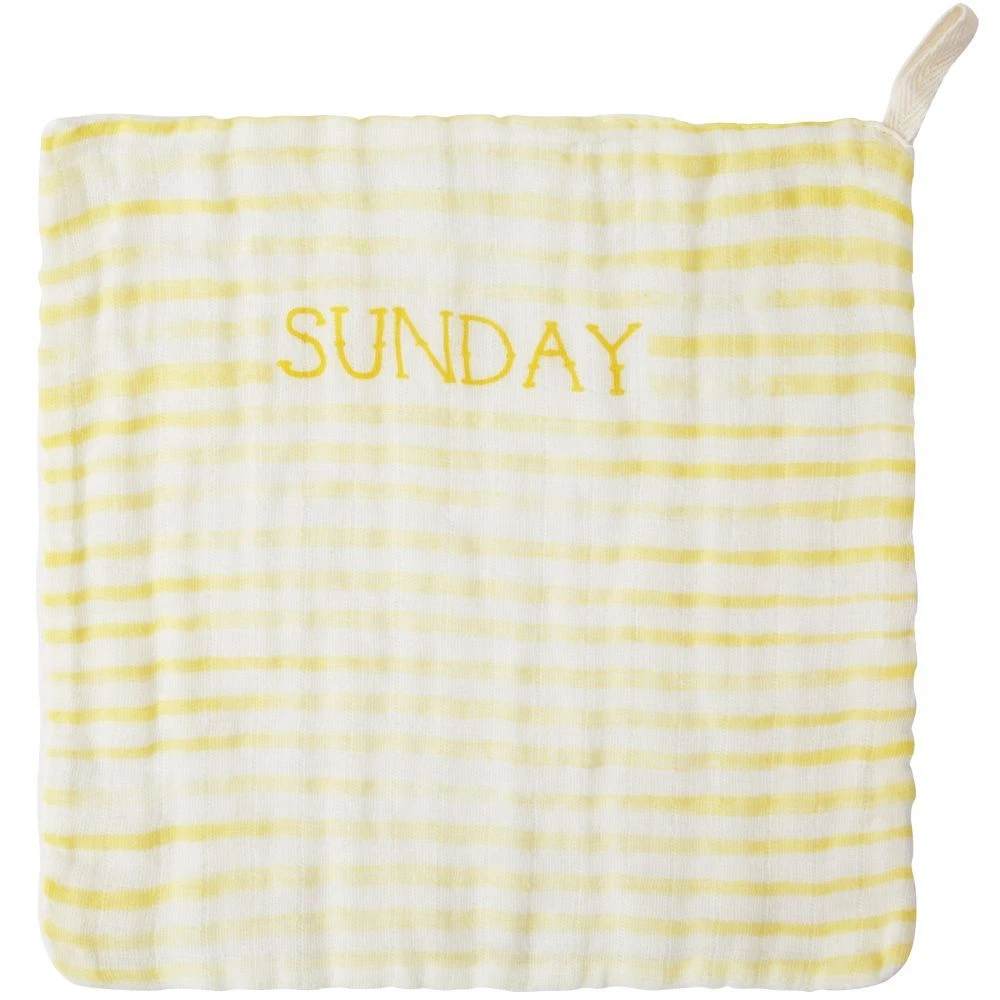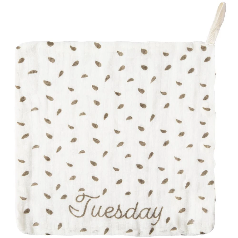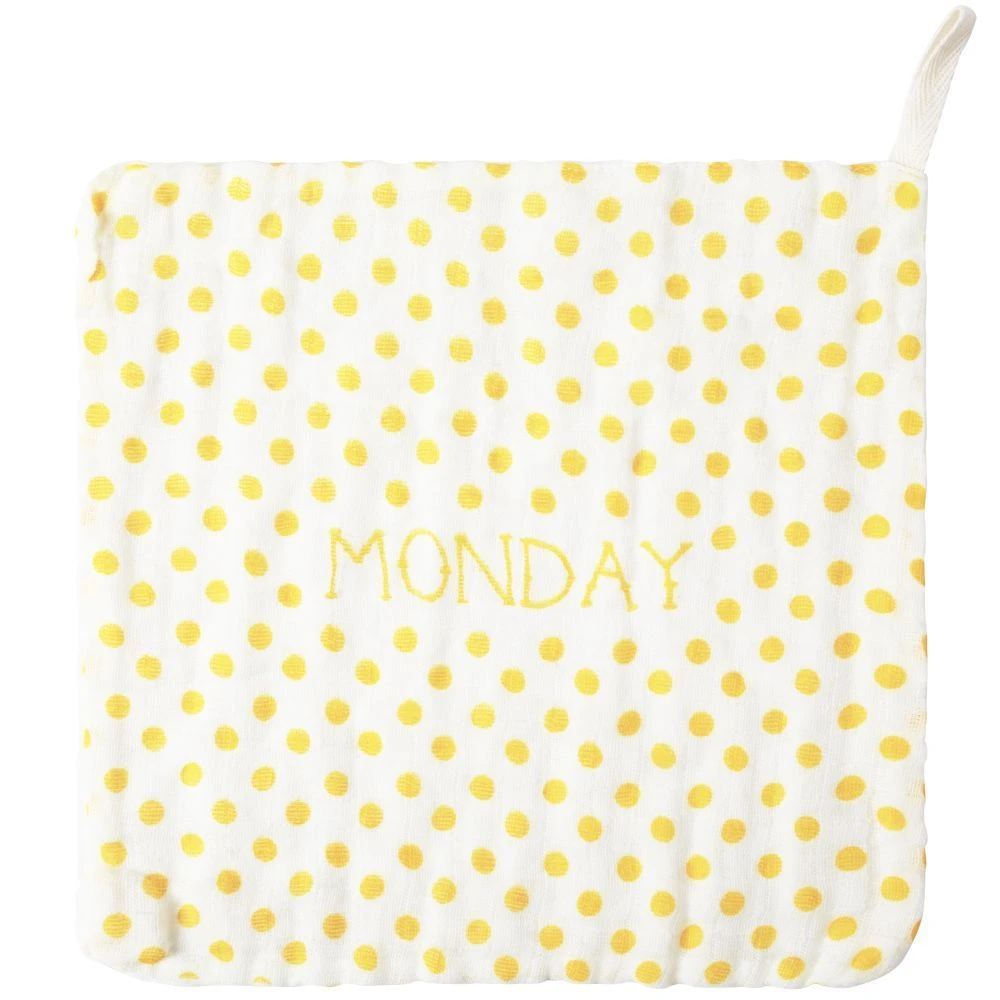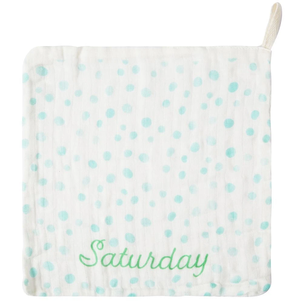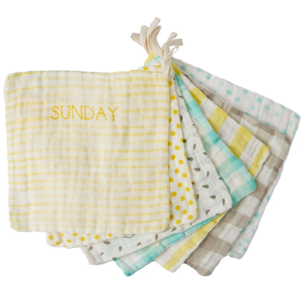 NEW! 100% cotton gauze days of the week washcloth set features adorable print designs on each along with a day of the week. Hemmed edges, printed one side, includes loop hanger on each. Gift Boxed Artist Keri Steckler