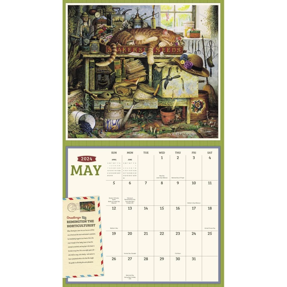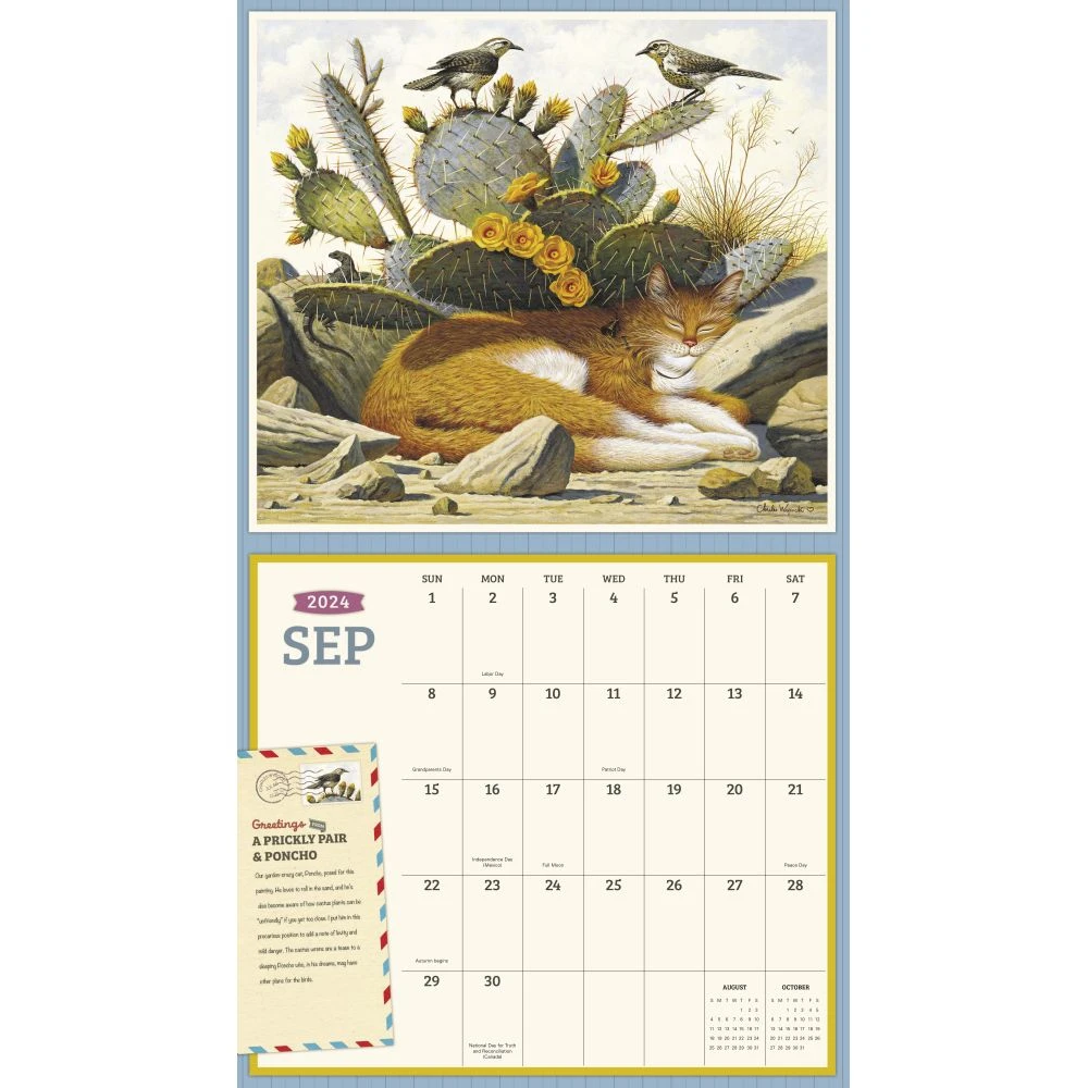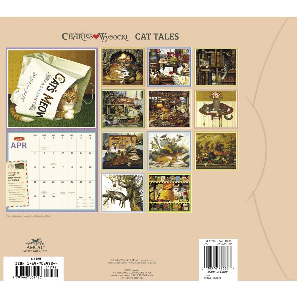The fabulous felines of Charles Wysocki are always the purr fect accompaniment to any year. This calendar covers a 12 month date range from January 2024 December 2024. Filled with warmth and Wysocki?s signature details, these cat paintings are guaranteed to charm you with a new image each month. . Hang on a wall in your home, office or at school for a full year of planning and beyond. Printed on glossy textured paper suitable for pen and pencil notetaking. Measures 13.5″ x 12″ closed, 13.5″ x 24″ open.